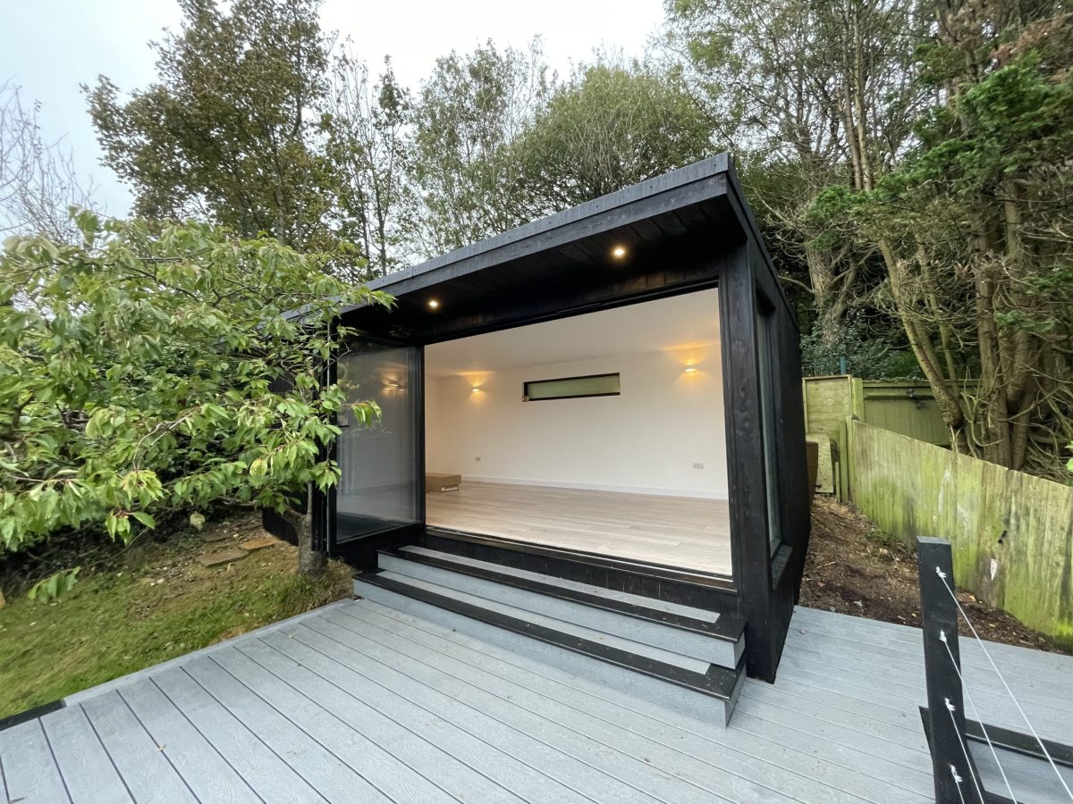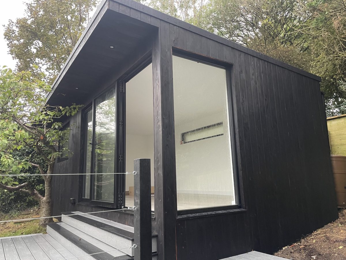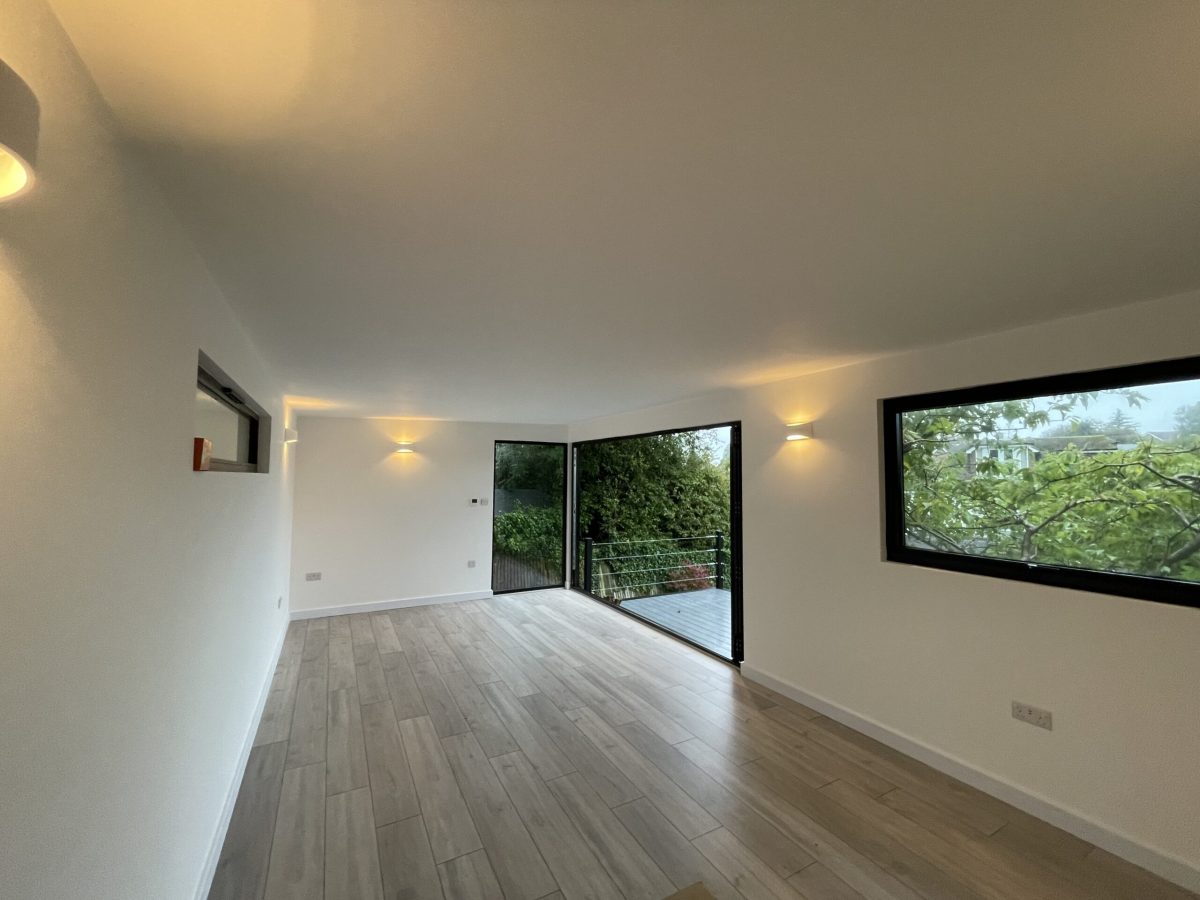 Sophie and Hugh had an old summer house at the top of their garden, and wanted it replaced with a contemporary, flexible and airy room. Both work from home, and while they wanted enough room for desk-space, they also wanted a multifunctional family room for their children to use too. To allow in lots of light, we included a large full length casement window to one side and for ventilation we added a top hung window on the front and rear. We incorporated the slope of the garden by building a deck area to the front of the 3m wide bi-fold doors with a planter to soften the view from the house. The result is a stunning, modern-looking garden room with enough space for the whole family to work and play.