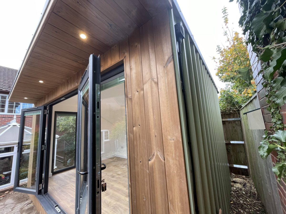 Linda was looking for a quiet, contemplative space for her daily yoga practice, so we cleared an unused, overgrown area in the corner of the garden to build her a 4.5m x 3m studio. To let in plenty of light, we included a full length casement window and side-lights to the French doors on the front. The overhang has recessed LEDs, and the Thermowood cladding blends the room into the surrounding garden.
